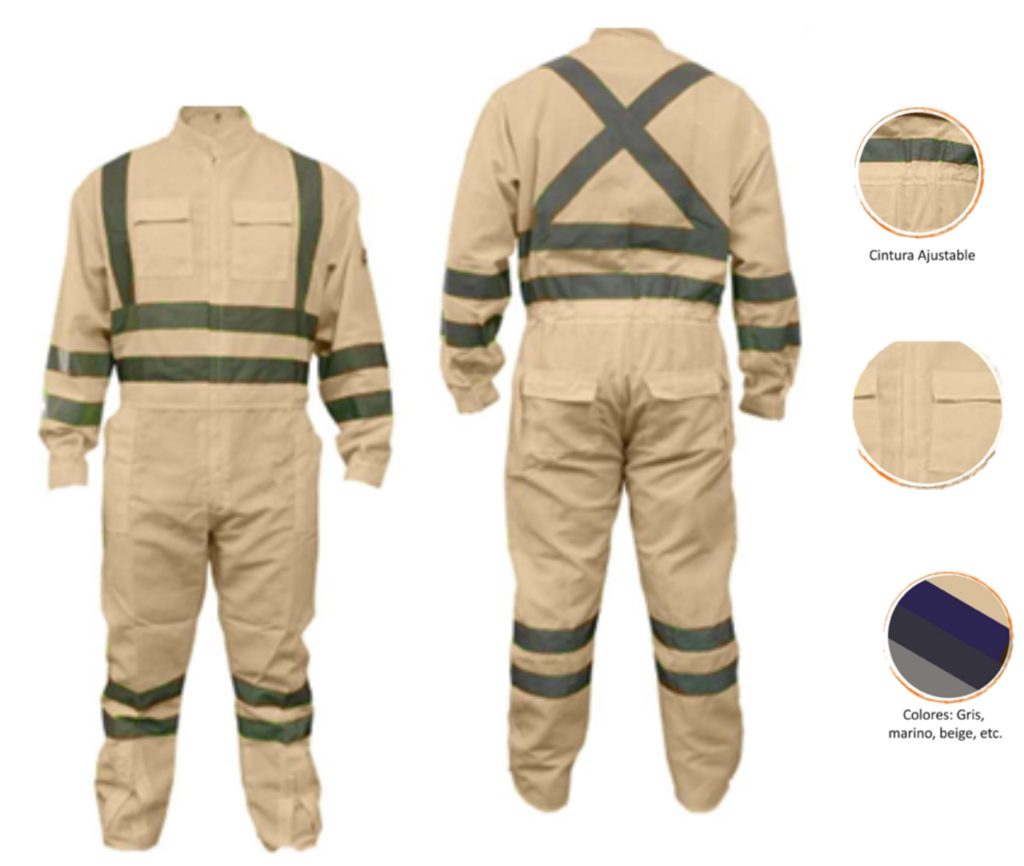 OverolGabardina100% algodóno 80% poliéster- 20% algodóncon o sin cinta reflejantebolsas pecho, frente y trascierre